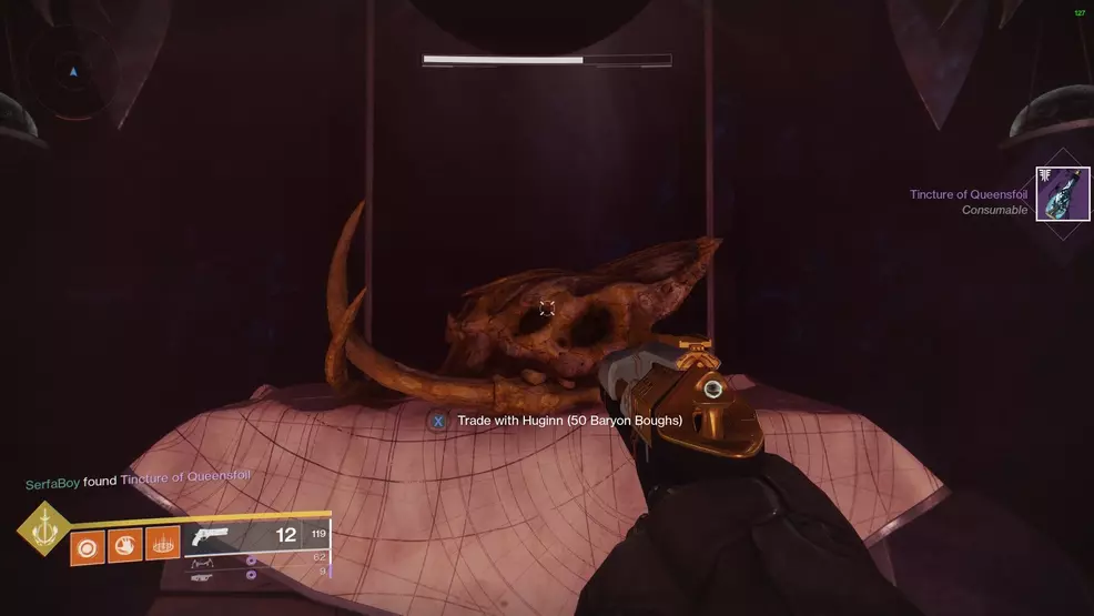 Exit the caves to reach a large room with a lot of statues and two side rooms on either side. The room on the right has the Huginn skull which you can interact with to purchase the Tincture of Queensfoil. You must have at least 50 Baryon Boughs in your inventory or Huginn will ignore you. The skull will also ignore you if you're holding a full stack of the tinctures.