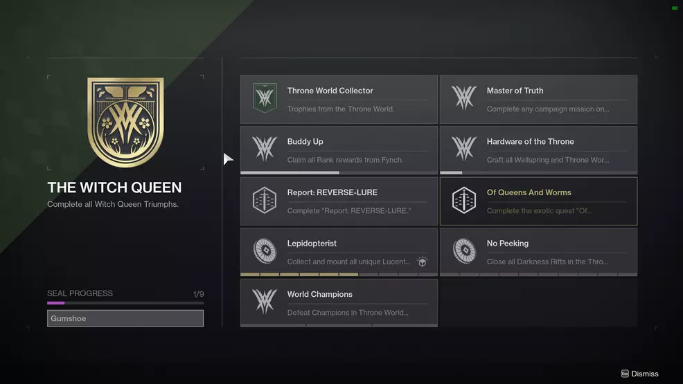 Beyond the above nine Triumphs, there are a myriad of other Triumphs for players to earn during the Witch Queen. These are not needed for the Gumshoe Title, offering instead rewards and Triumph score. These Triumphs are listed under the Throne World node in the Triumphs tab.